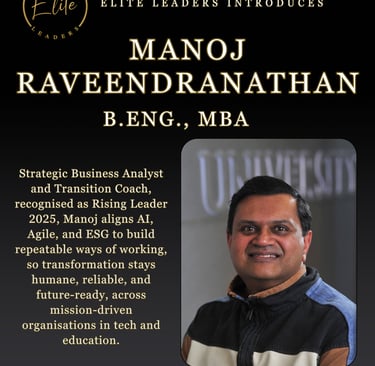 Manoj Raveendranathan, B.Eng., MBA, brings a steady hand to rooms where details decide outcomes. A Strategic Business Analyst, Transition Coach, and Change Catalyst based in Cambridge, he helps organisations make excellence repeatable without making it feel mechanical, aligning technology with human judgment and purpose. Honoured as Rising Leader 2025 at the Veblen Directors Leadership Awards, he champions ethical innovation, responsible AI, and ESG as practical levers for growth rather than slogans.